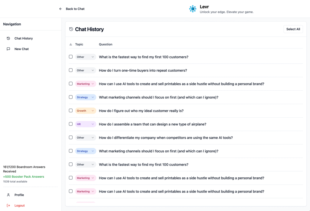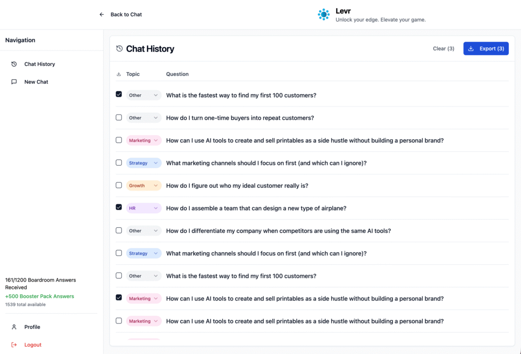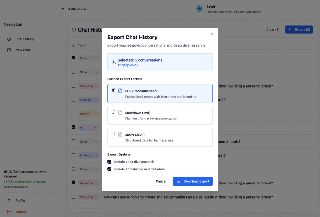 Export your boardroom answers as PDF, JSON, or CSV files to share insights, analyze data, or integrate with other tools.
